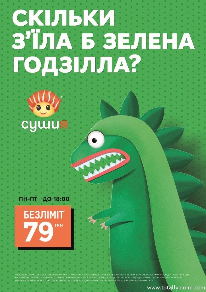 Этим летом «Сушия» решили поставить эксперимент «Скільки з’їла б зелена Годзілла за 79 грн» и предложить гостям осилить 8 блюд всего за 79 грн. Если вы считаете свой желудок довольно вместительным, то вам предложат блюда из специального акционного меню – суши-бар, супы, горячие блюда, всего 34 позиции на выбор, исключение составят лишь напитки и десерты.