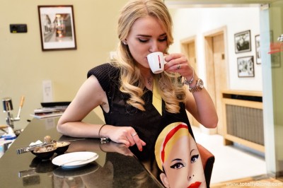 Так как у нас было хорошее настроение, команда из трёх девочек и масса свободного времени, мы представили, как могло бы выглядеть утро какой-то знаменитости, которая скрывается от взглядов навязчивых фотографов, ищет укромный уголок, чтобы спокойно выпить чашечку утреннего кофе, как готовится встретить день, и выбирает себе наряд. А может быть дурачится, катаясь на барных стульях в ресторане :)