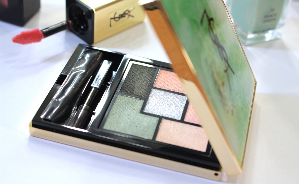Палетка Indie Jaspe это просто восторг! Насколько же она красива снаружи, этот нефритовый узор в золотом обрамлении, под крышечкой которого пять оттенков теней: сатиновый персиковый, золотистый сатин, мерцающий мятный, зелёный с шиммером и серебряный с россыпью ярких блёсток. Конечно, эти тени не могут похвастаться пигментацией, для меня палетки YSL это всегда полутона, лёгкое покрытие, но и переборщить этим цветами тоже нельзя. На ощупь мягкие и податливые, лучше всего наносить их пальцами, а края растушевывать кистью, если мы говорим о базовых оттенках. Мерцающие цвета лучше всего наносить на базу и сразу влажным способом, тогда они проявят себя во всей красе и меньше осыпятся. Особенно, что касается центрального оттенка, похожего на горсть драгоценных бриллиантов, настолько ярко и живо мерцает каждая блёстка в этом оттенке.